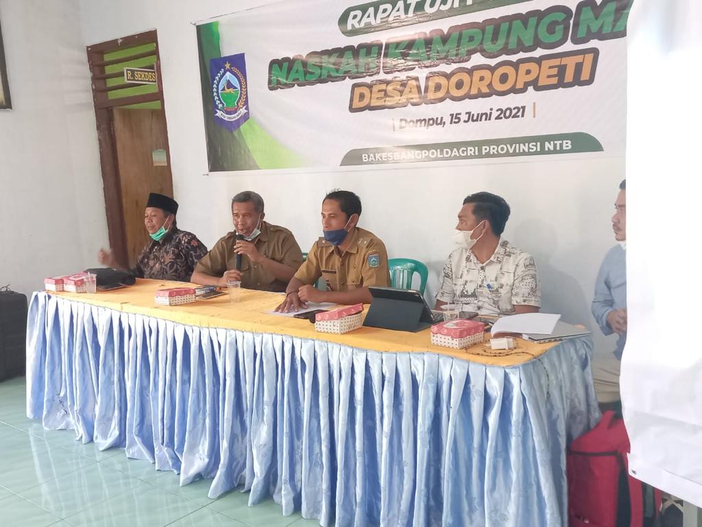 Rancangan naskah awal diserahkan langsung oleh Kepala Desa Doropeti, Dahlan, S.Pt. kepada tim kerja dari Badan Kesatuan Bangsa dan Politik Dalam Negeri (Bakesbangpoldagri) Provinsi NTB yang turun ke Dompu dipimpin langsung oleh Kepala Bidang Ketahanan Ekososbud, Agama, dan Ormas, Supri Karyadi, S.IP. Harapannya, kampung madani akan dapat direplikasi ke 71 desa lainnya di kabupaten yang dikenal dunia karena sejarah Gunung Tambora dan penyebutannya dalam naskah Sumpah Palapa Mahapatih Gajah Mada. Pada kegiatan ini, Pemprov NTB menghadirkan tim pakar dari Provinsi yang disandingkan dengan tim pakar daerah yang berasal dari unsur birokrasi terkait, tokoh adat, dan akademisi.