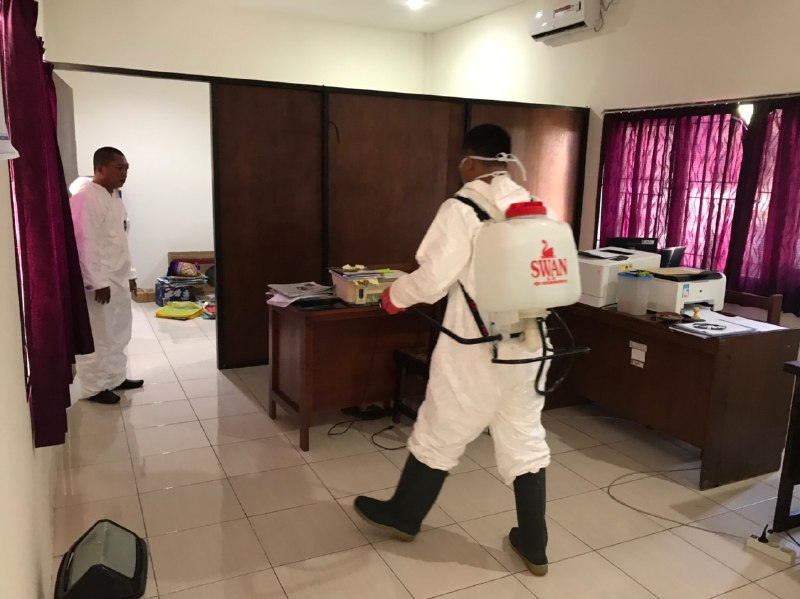 Guna mencegah penyebaran wabah covid-19 atau virus korona, pada hari ini Bakesbangpoldagri melakukan penyemprotan cairan desinfektan di setiap sudut ruang kerja dan tempat-tempat strategis lainnya.