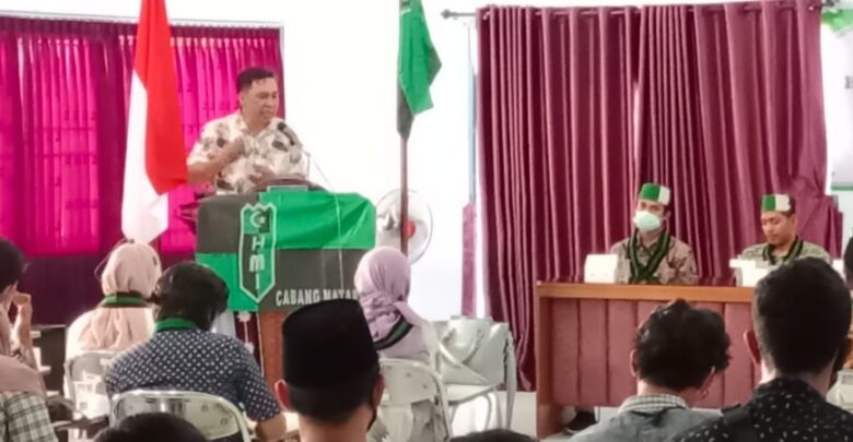 Mewakili Kepala Bakesbangpoldagri Provinsi NTB, Kabid Ekososbud Agama dan Ormas, Supri Karyadi memberikan sambutan pada Pembukaan Rapat Anggota Komisariat Universitas Teknologi Mataram Himpunan Mahasiswa Islam Cabang Mataram.